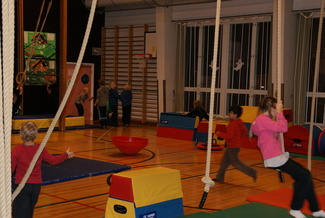 Keskiviikko iltojen liikuntahetki on tarkoitettu noin eskari-ikäisistä kakkosluokkalaisille, mutta pomppupatja kestää kyllä äidin tai isänkin painon. Vaskun pomppuun on vapaa pääsy.